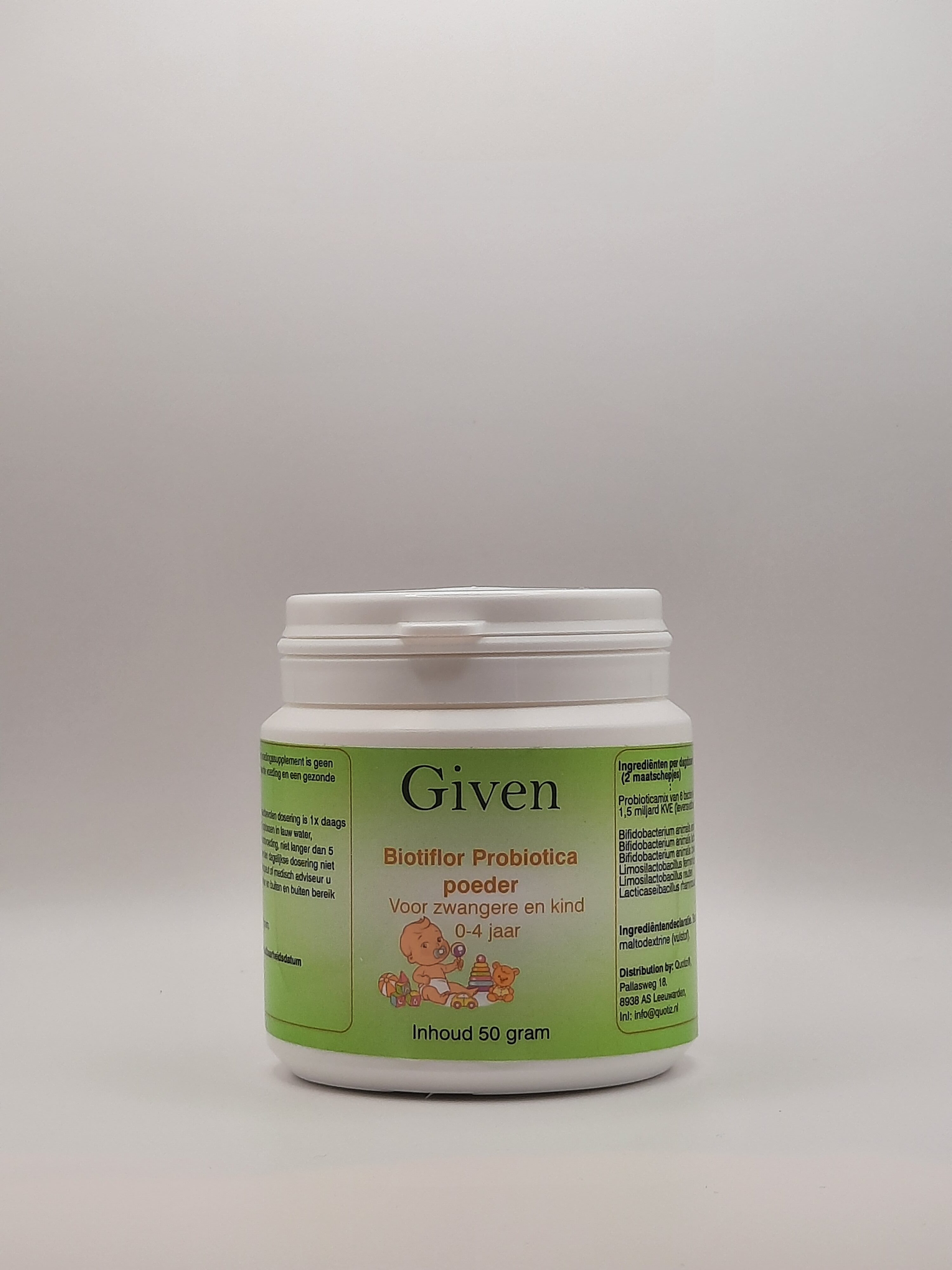 Tijdens zwangerschap, borstvoeding en de eerste levensfase is een gezonde darmflora van groot belang. Biotiflor Probiotica Moeder & Kind bevat een mix van 6 zorgvuldig geselecteerde bacteriestammen, in totaal 1,5 miljard KVE per dagdosering. Deze formule is vrij van allergenen en geschikt voor vegetariërs en veganisten.
