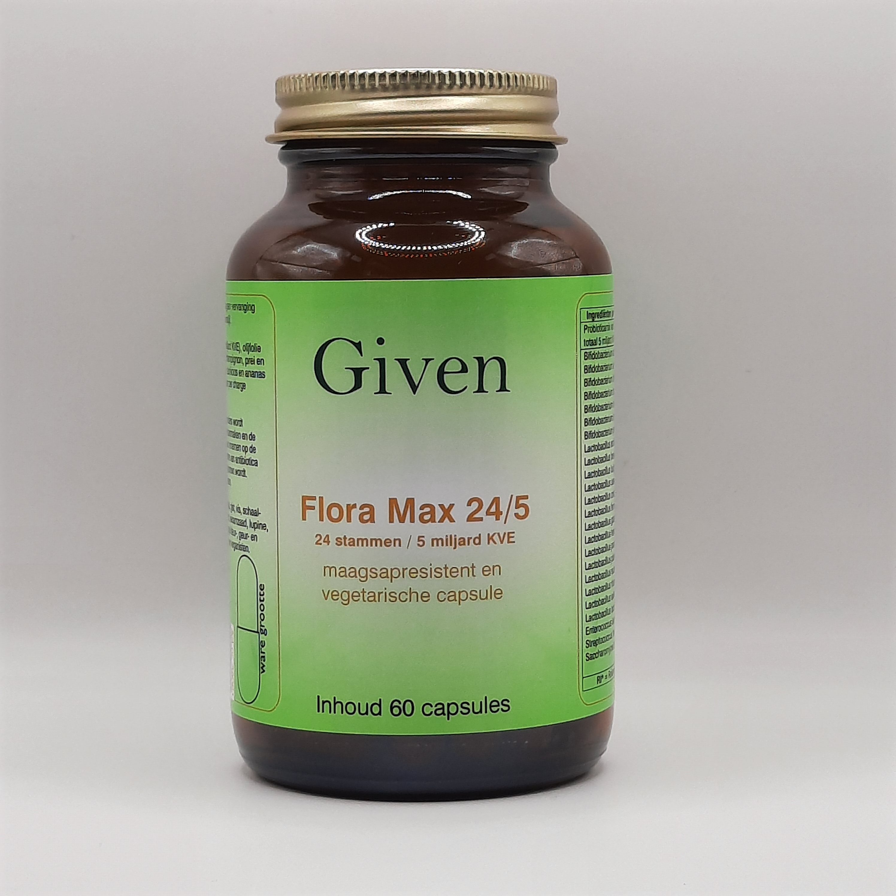 Flora Max 24/5 is ontwikkeld voor wie zijn darmflora breed wil ondersteunen. Deze formule combineert 24 bacteriestammen met een totaal van 5 miljard KVE per capsule. De toevoeging van fruit- en groentemix fungeert als prebiotica: voeding voor de bacteriën, zodat zij optimaal hun werk kunnen doen in de darmen. Dankzij de maagsapresistente capsules overleven de bacteriën de maagpassage en bereiken ze levend de darmen.