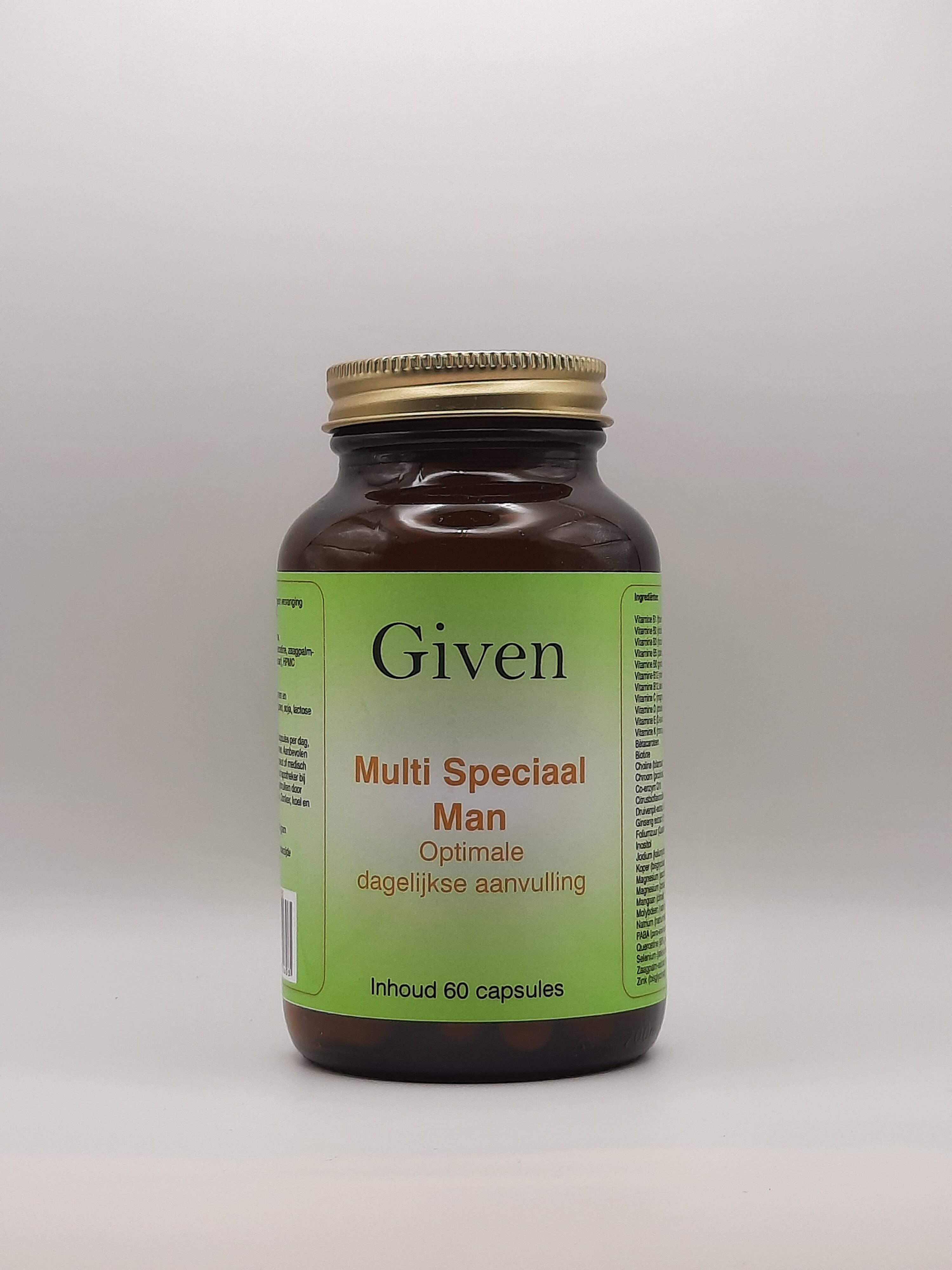 Multi Speciaal Man is een hoogwaardige multivitamine die speciaal is afgestemd op de behoeften van mannen. Het bevat een zorgvuldig samengestelde combinatie van vitaminen, mineralen, antioxidanten en krachtige kruidenextracten zoals ginseng, zaagpalm en druivenpitextract. Deze formule ondersteunt energie, vitaliteit, weerstand en algehele gezondheid. Dankzij de uitgebalanceerde samenstelling is dit supplement ideaal voor dagelijks gebruik door mannen die bewust met hun gezondheid omgaan.